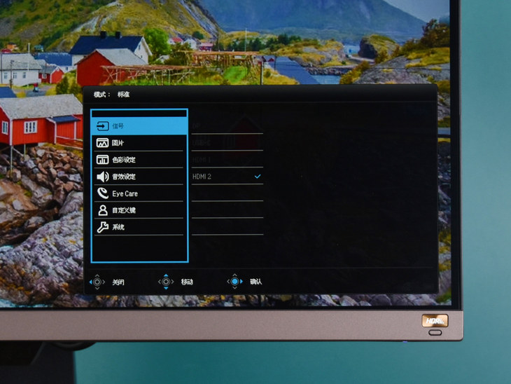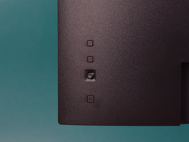 屏幕背面左侧设计了四枚按键,从上到下分别为信号源切换按键、色彩模式按键、主控摇杆按键、电源键。