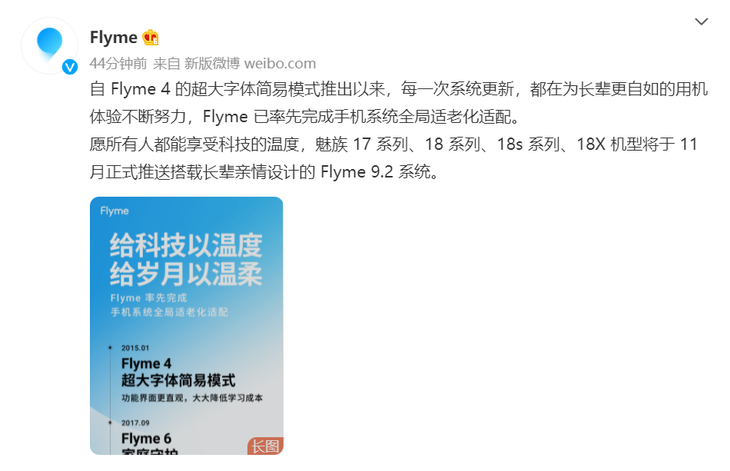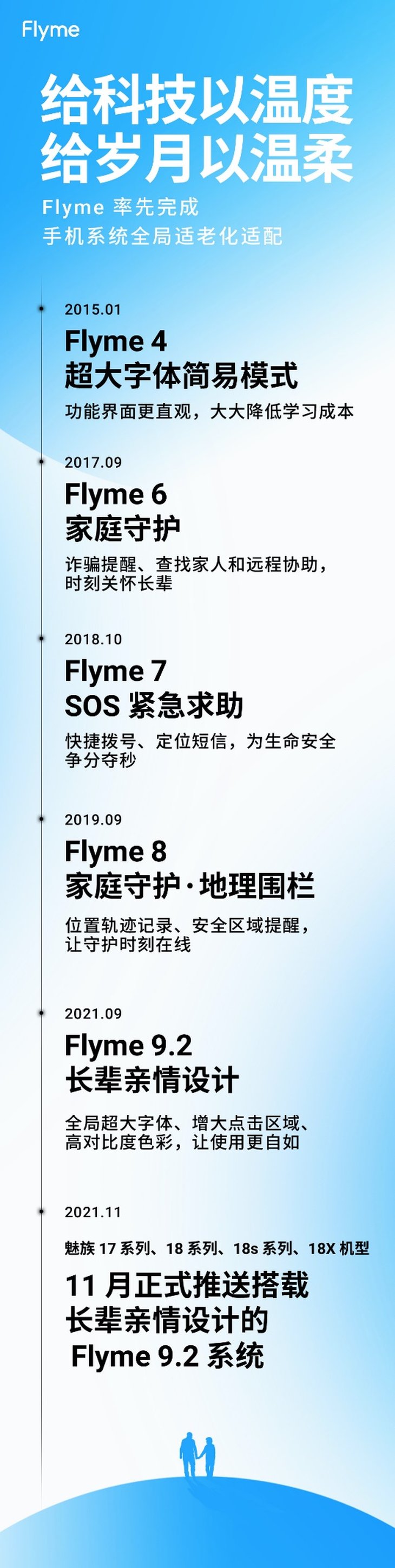 10月14日,Flyme官方宣布,魅族 17 系列、18 系列、18s 系列、18X 机型将会在11月正式推送搭载长辈亲情设计的 Flyme 9.2 系统。