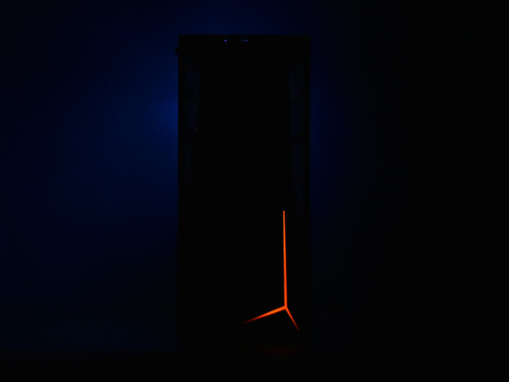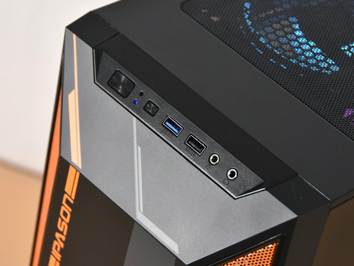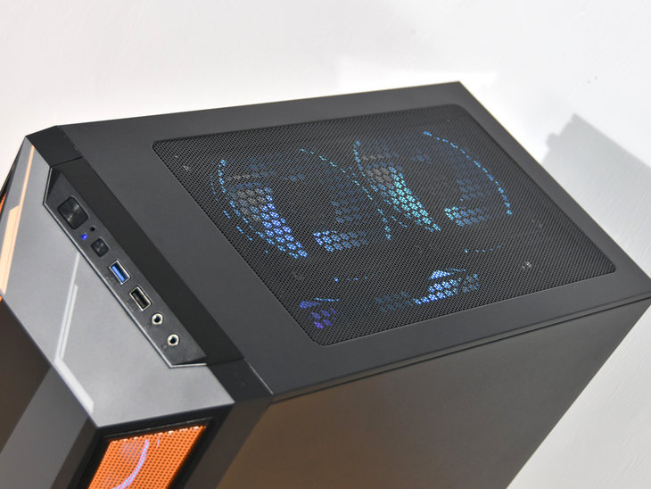 机箱前脸上面设计有个性化的图案,并且设计了通风散热隔栏以及橙色的电竞氛围灯。