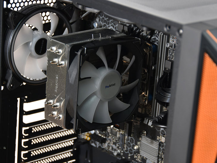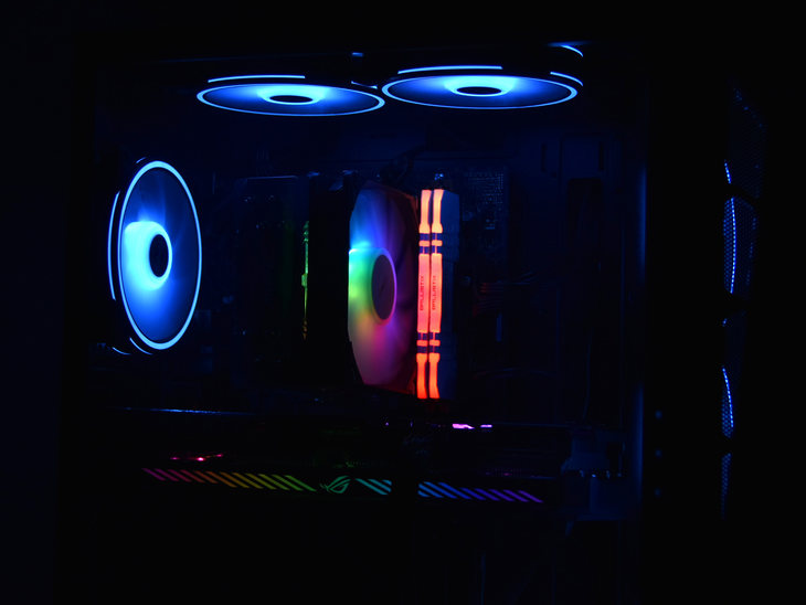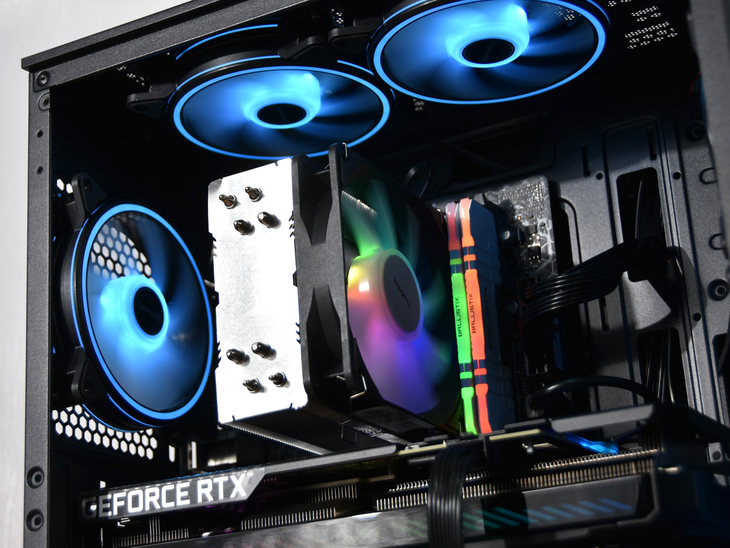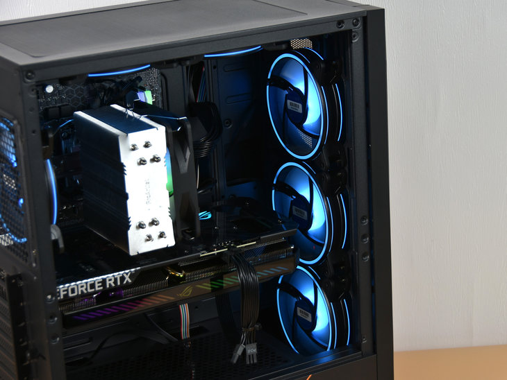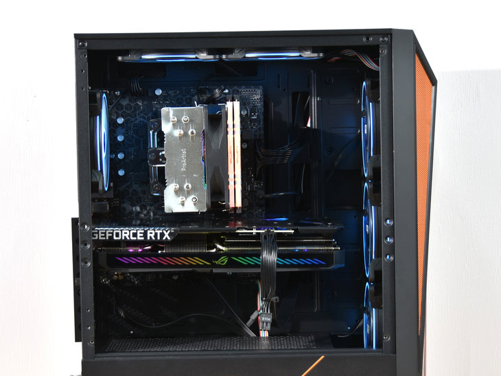 笔者评测的这款机器,为酷睿i5-10400F处理器搭配的是一台风冷散热器,配备有4根导热管。同时该散热器的风扇搭配了RGB灯效。