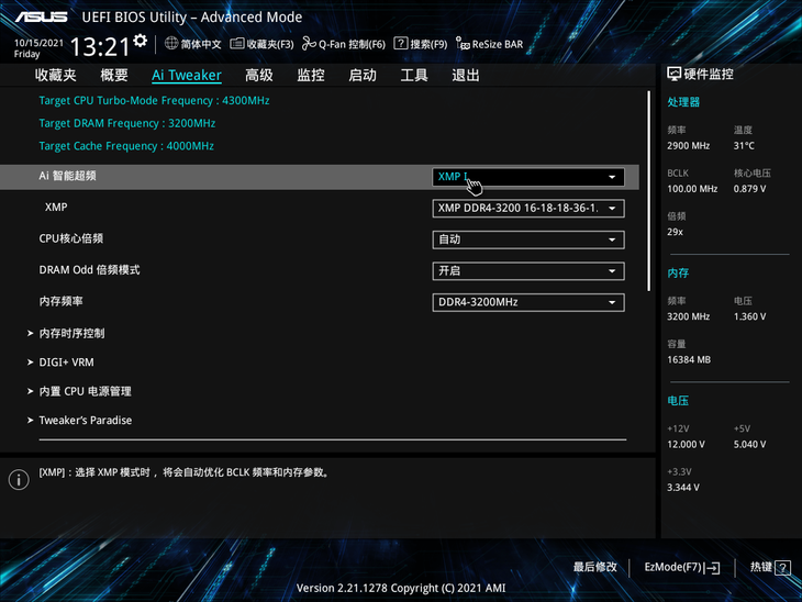 注意,玩家在收到电脑后,需要先在主板BIOS中,将Ai智能超频设置成XMP模式,这样电脑才会在DDR4-3200的内存频率下运行。