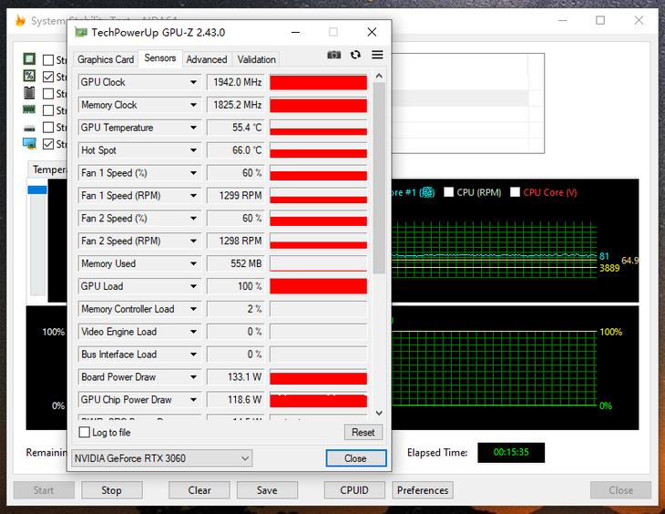 通过15分钟的双烤之后,这款游戏主机的CPU温度稳定在了约81℃,频率温度在了约3.88GHz。GPU温度稳定在了约55℃,GPU频率稳定在了约1942MHz。显而易见,攀升战境S5的散热系统是很可靠的。