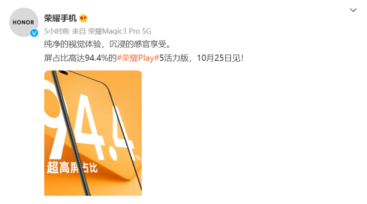10月22日,官方公布了荣耀Play5活力版正面图。