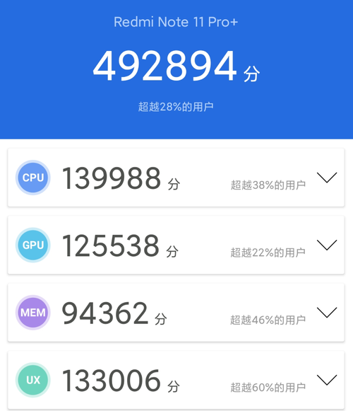 经过实测,Redmi Note 11 Pro+的跑分为492894分。