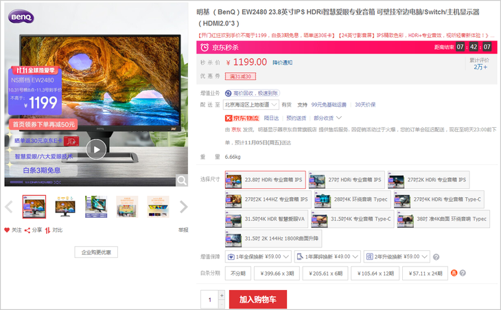 1199好价!明基EW2480显示器11.11大促