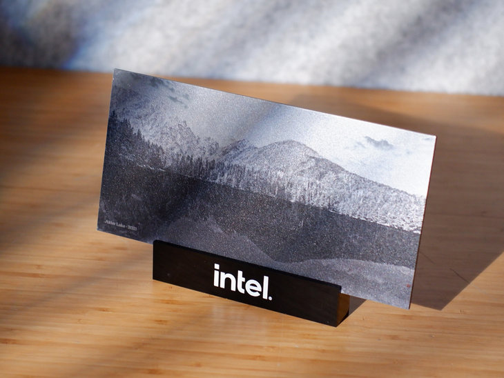 包装盒里面附带了一套桌摆,一面画的是第12代台式机处理器的架构图。另一面画了一张山水画。