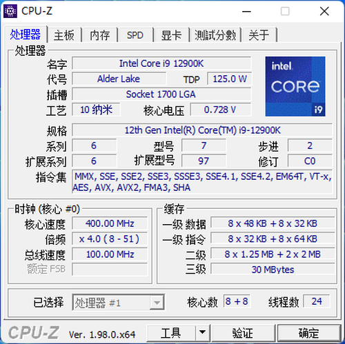 旗舰级的酷睿i9-12900K采用8+8核心、24线程设计,默认睿频高达5.2GHz,三级缓存容量为30MB,TDP为125W。因为这一代的性能核支持超线程,能效核不支持超线程,所以2×8+8=24,也就是总共24个线程。