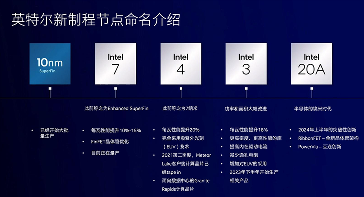 英特尔此前推出的英特尔10nm工艺将依然称之为英特尔10nm,而在10nm之后的增强型SuperFin上,将从以前的命名更改为全新的Intel 7。根据英特尔官方的介绍,Intel 7和此前的英特尔10nm SuperFin相比,每瓦性能将提升约10%~15%。