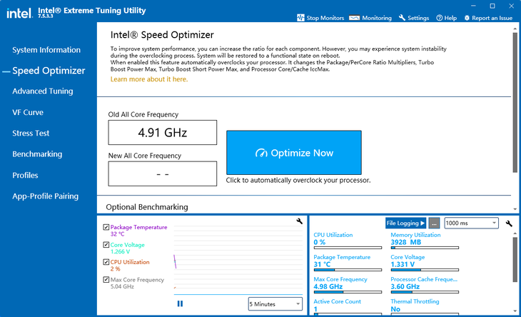在“Speed Optimize”界面下点击醒目的“Optimize Now”按钮,英特尔XTU便会对处理器进行“一键超频”。