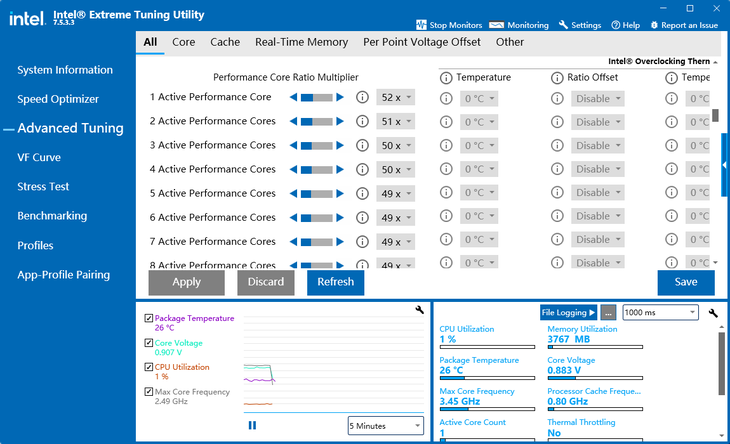 除了"一键超频"之外,玩家们还可利用英特尔XTU这款软件直接手动去进行动态超频。打开英特尔XTU这款软件,点击进入“Advanced Tuning”界面,便可以对处理器进行超频操作。