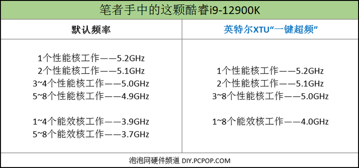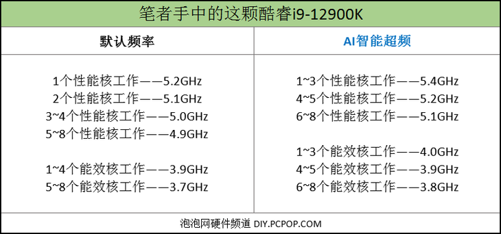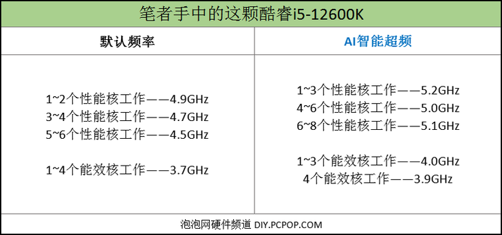 关于酷睿i9-12900K处理器和酷睿i5-12600K处理器加载AI智能超频之后的结果,笔者列出了一张频率对比表格。(CPU的详细频率可以直接利用英特尔XTU这款软件识别。)