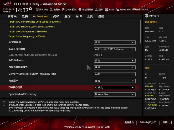 在主板BIOS中找到“CPU核心倍频”选项,然后选择“AI优化”设置,AI智能超频便会在系统重启后自动开启。