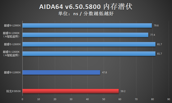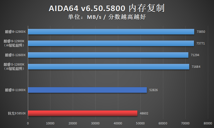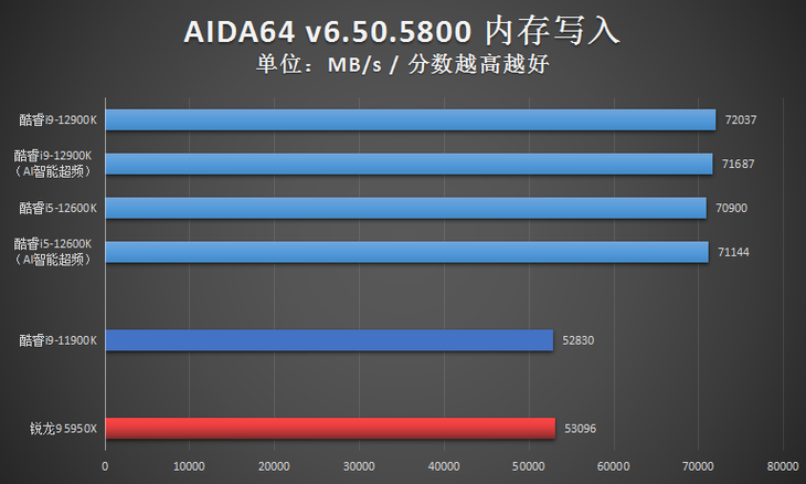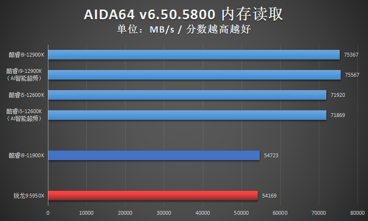 由于在AIDA64的CPU测试项目中,英特尔第12代台式机处理器很多成绩还没有自家10代、11代处理器的高,成绩异常,因此笔者仅放出了AIDA64的内存性能测试成绩。