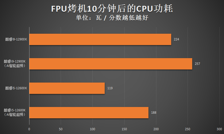 测试小结:酷睿i9-12900K默认频率下的功耗已经在200W开外了,这个结果算是意料之中的。