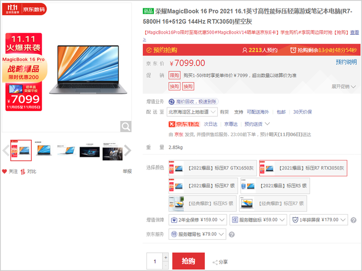 怎么样,面对如此出色的荣耀MagicBook 16 Pro,大家放心购买就是了。眼下11.11期间,锐龙7 5800H满血版八核处理器搭配GeForce RTX 3050显卡机型只要7099元,相当划算了!