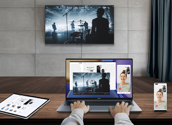 荣耀MagicBook 16 Pro还支持高效的多屏协同功能,能够轻松实现手机与PC端的连接交互,可以在电脑上直接控制手机,实现在电脑端刷朋友圈、抖音等操作。另外手机与电脑之间的数据共享也变得更加简单,手机和PC端文件传输直接通过拖拽完成,带来更高效的操作体验。
