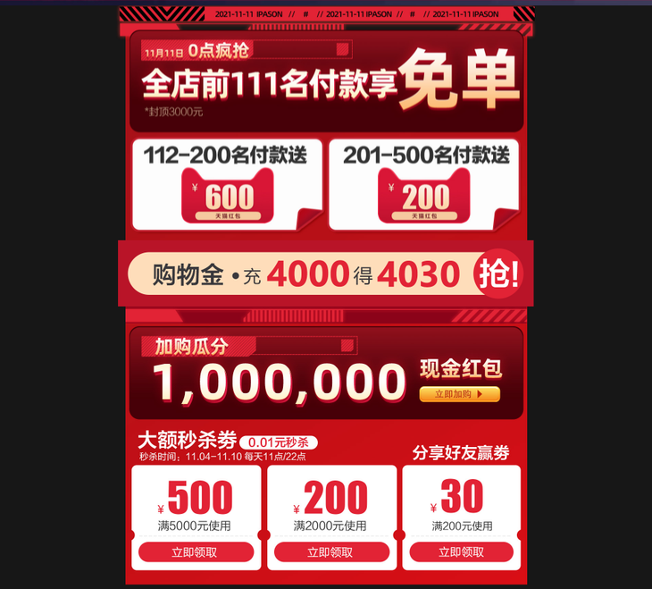 今年11.11,IPASON攀升官方旗舰店的促销活动可谓相当劲爆!11月11号当天全店前111名消费者付款享免单(封顶3000元),112~200名消费者付款送600元天猫红包,201~500名消费者付款送200元天猫红包,近期有意购置新电脑的用户们千万不要错过了!
