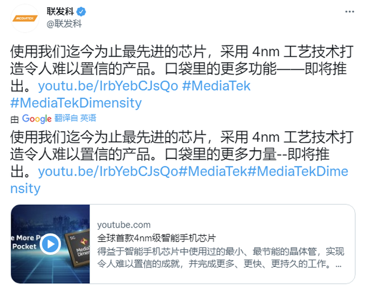 11 月 12 日消息,联发科方面近日开始了旗下新产品的预告,在预告中表示手机上首款基于4nm工艺的SoC即将推出。从一系列的消息来看,联发科将有可能在近期发布全球首款基于4nm工艺打造的产品,该款产品应该是联发科最新的旗舰产品——天玑2000。
