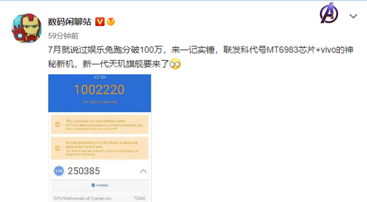 除此之外在今日有数码博主放出了疑似vivo旗下某款采用天玑2000芯片的工程机跑分信息。可以看到在安兔兔跑分中其成绩突破了百万级别。