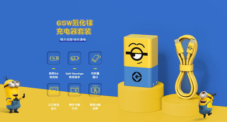 除了氘锋系列,努比亚还推出了方糖与小黄人系列产品。方糖系列多种配色可选,体型小巧,采用可折叠插脚设计,最高支持65W充电功率,支持PD、QC等主流快充协议。小黄人系列充电产品,包含小黄人数据线、磁吸无线充、氮化镓套装、磁吸充电宝、超薄充电器等人气联名新品,这些产品都融入了可爱的小黄人元素,充电时也能感受不一样的快乐。
