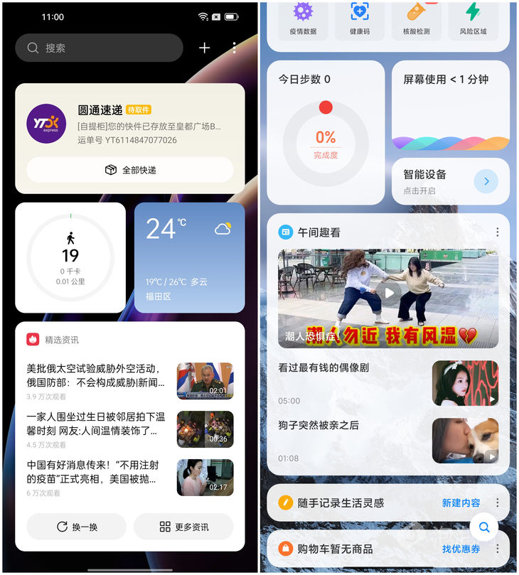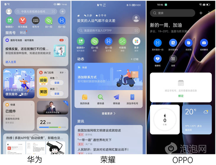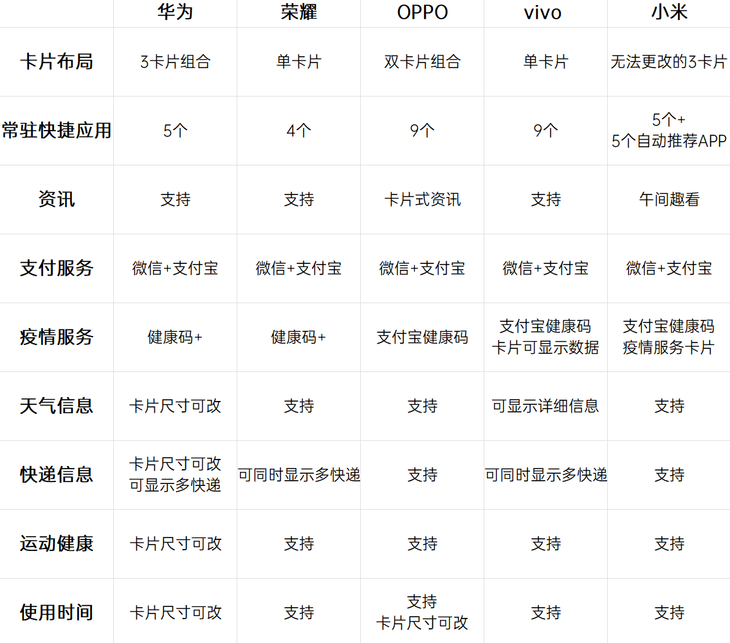 5款手机基本都采用了快捷功能区+应用卡片区+新闻区组合设计,功能分区明确,能够清晰呈现出对应的信息。在个性化方面,华为和OPPO的负一屏自定义程度最高,多样式卡片带来更高的摆放自由度,不同类型信息可以聚合显示。
