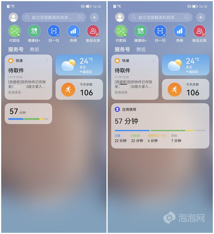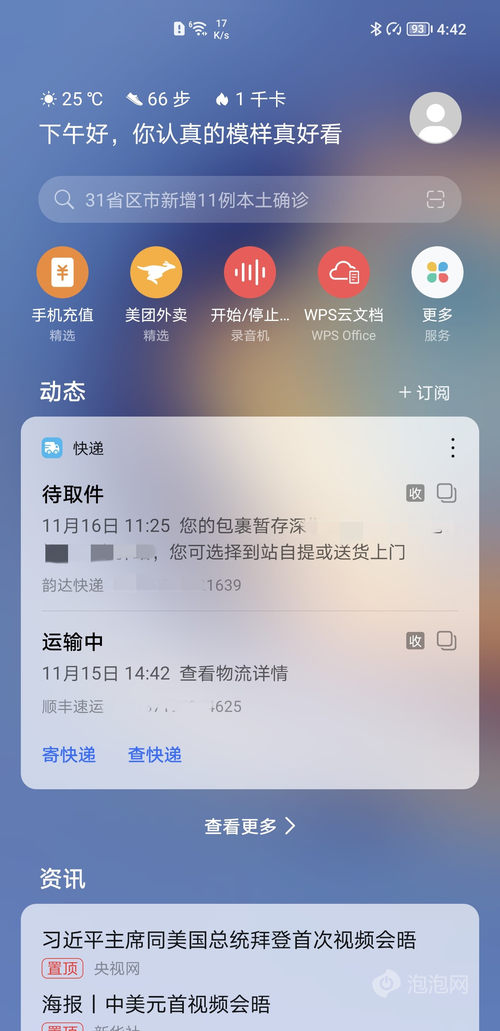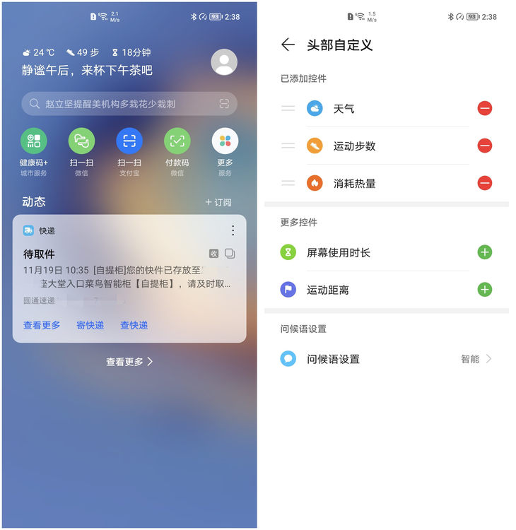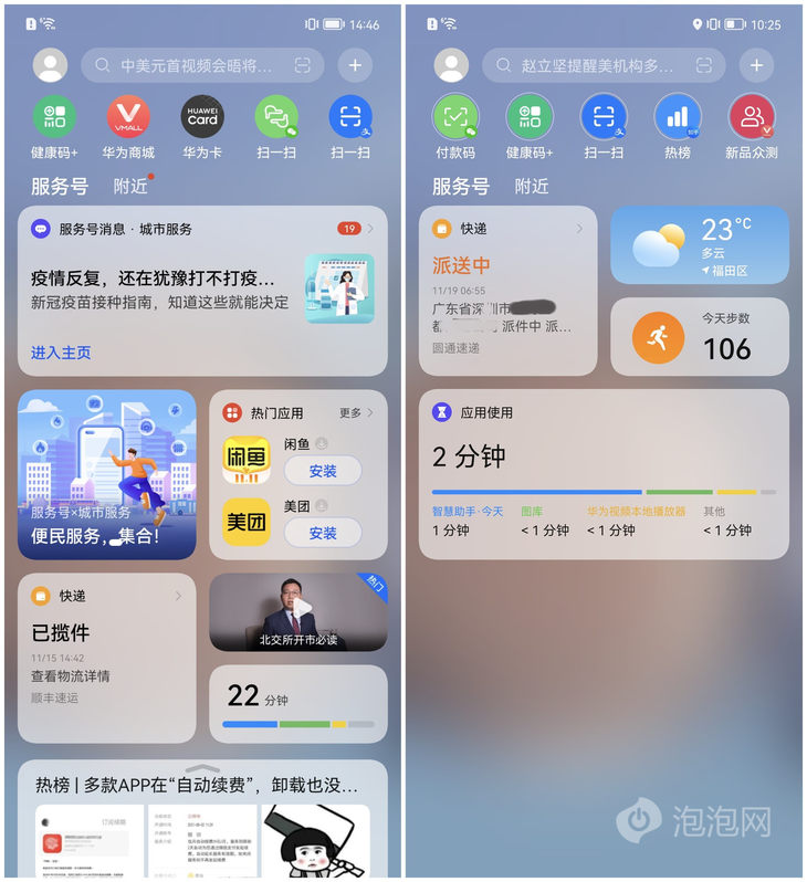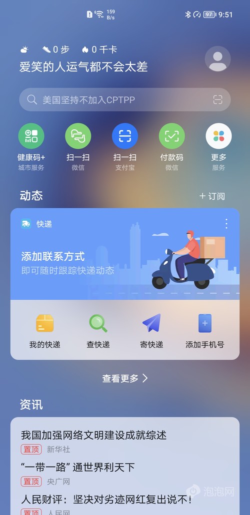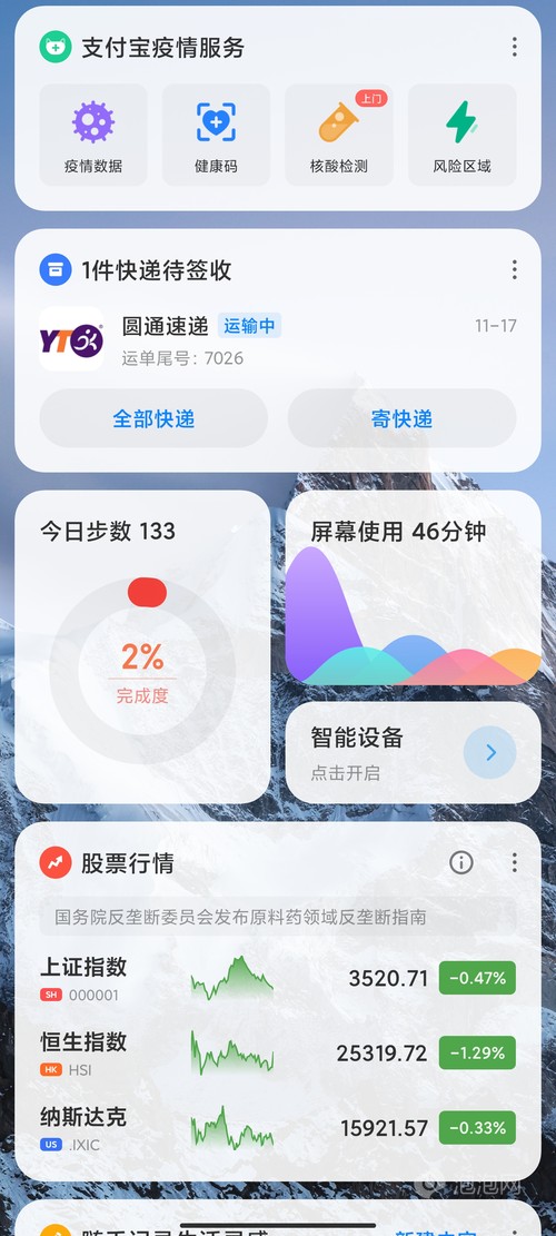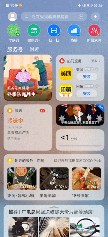 华为负一屏准备了海量卡片应用,包括系统级天气、快递等应用,这部分应用会在卡片上直接显示相关信息,无需点击就能获取到关键信息,部分第三方应用也能在卡片上直接显示关键信息或者支持直接交互,这类型的卡片体验上要更好。