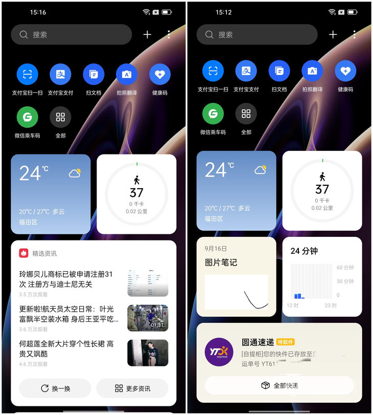 5款手机的负一屏都集成了丰富的功能,常用核心功能基本都有,比如付款码、快递信息、天气信息等,能够作为呈现关键信息的聚合平台,方便了解各方面信息动态。个人觉得,负一屏的功能不一定要多全面,反而可以精品化,针对负一屏的特性,带来负一屏独有的便捷体验,这些对于负一屏可能更加重要。