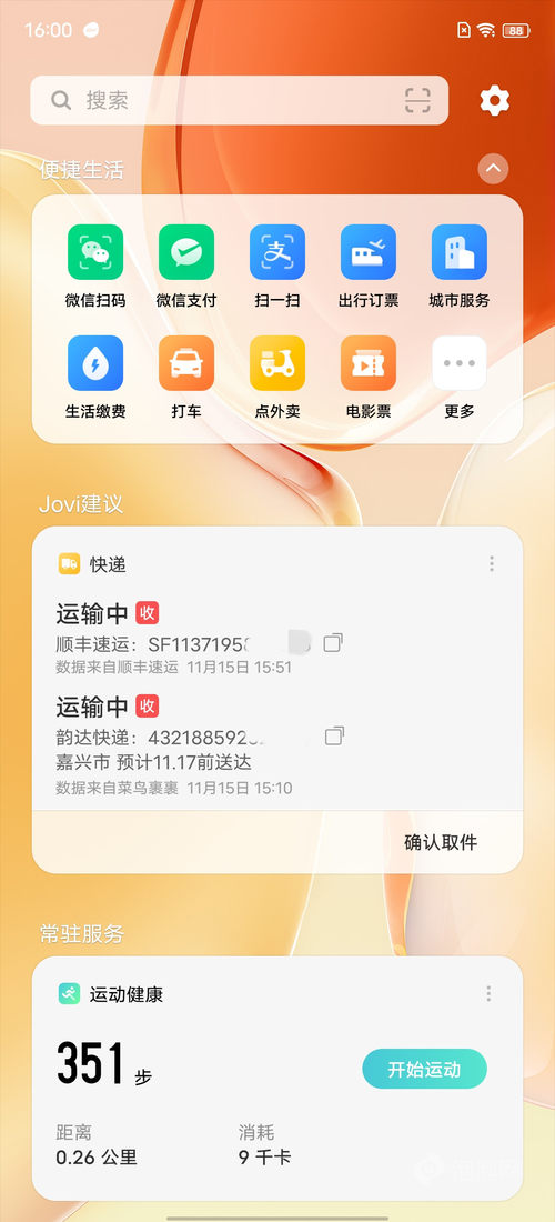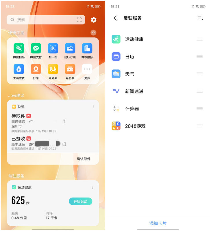 vivo的快递卡片同样只有一种尺寸,可以显示快递状态、单号、预计送达时间等,可同时显示多个快递,快递服务合作商为菜鸟裹裹、京东、丰巢快递柜、顺丰速运和快递100,实际体验中韵达、圆通、顺丰速运等主流快递都能及时显示物流信息。