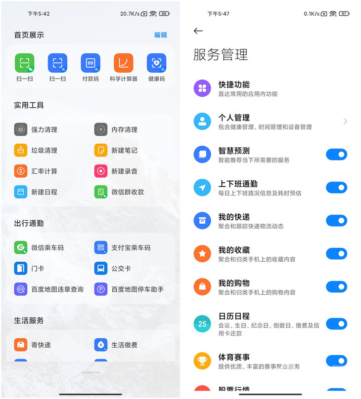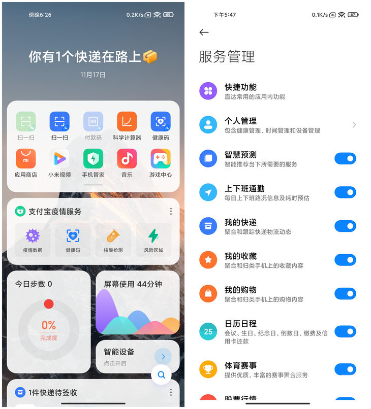 小米的负一屏默认快捷功能应用比vivo更少一点,集合了常见功能,已经可以满足很多场景的需求。快捷应用区域做了滑动快速展开全部快捷应用功能,包括上面提到的几款机型,能够常驻负一屏界面的快捷应用图标数量都不多,这种设计有助于提升便利性。