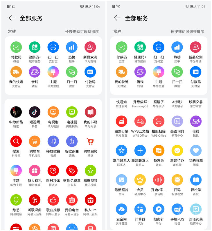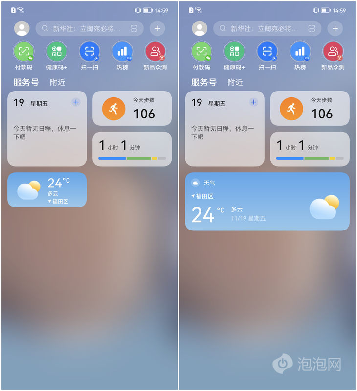 在应用卡片区域,华为机型支持多样式卡片,可以并排放置两个卡片,支持正方形卡片+两个小长条形卡片组合并排摆放,同样区域可显示更多不同类型的内容。