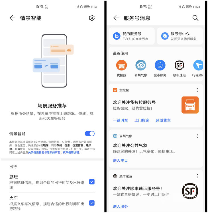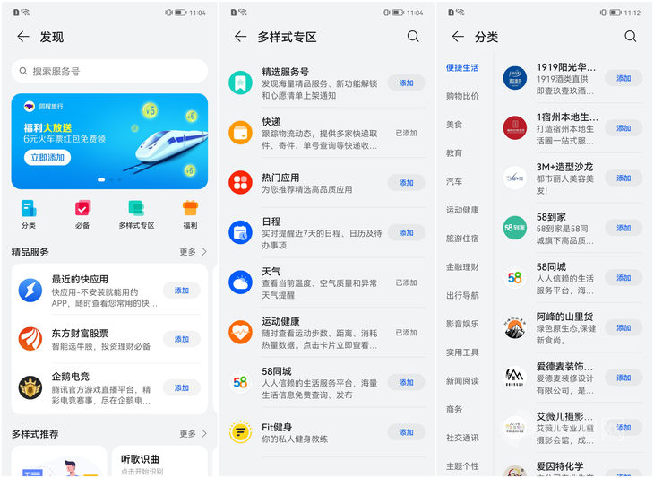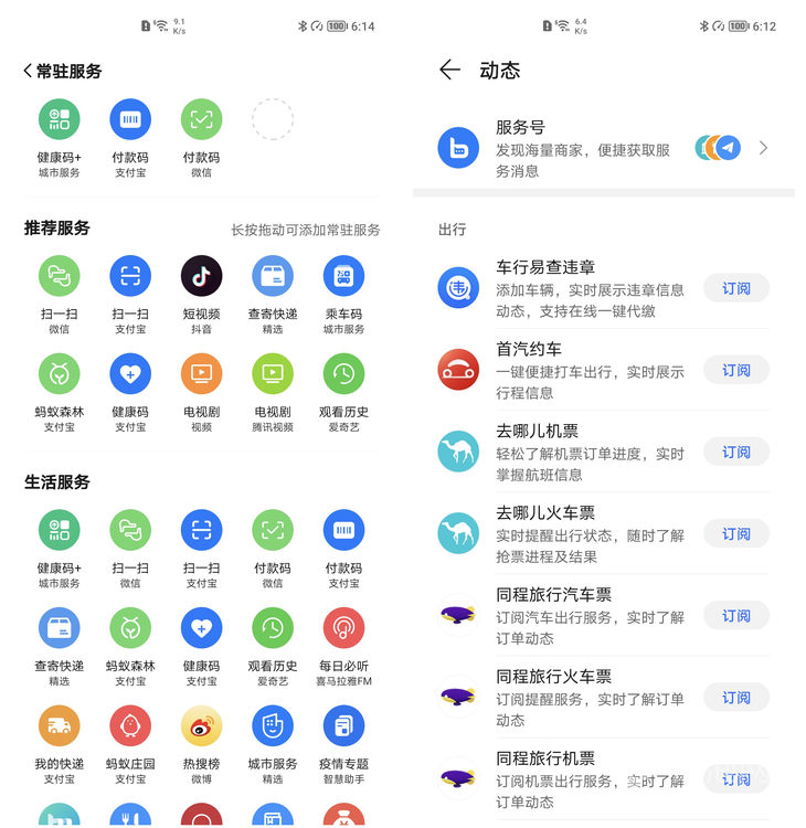 在卡片区域,荣耀分为服务号和常规卡片两种类型,服务号与华为类似,涵盖了购物娱乐、出行等方面,数量丰富,但基本都是提供不同服务商的快捷跳转功能。荣耀把服务号进行了整合,所有订阅的服务号都集合在同一个卡片里,避免了负一屏卡片过于繁多。