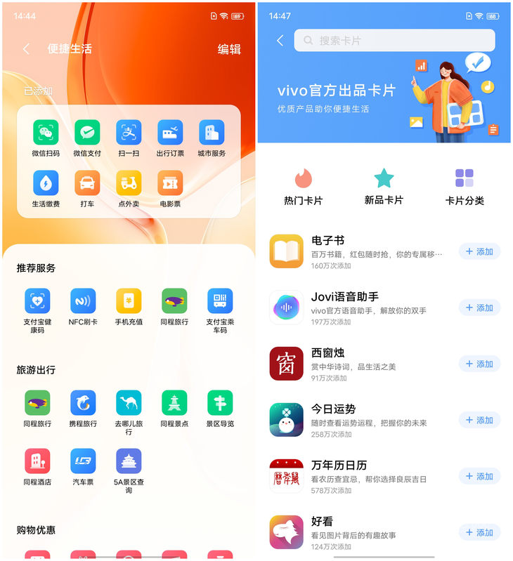 vivo的负一屏快捷功能应用同样也是第三方应用+系统级应用捷径组合,在数量上比华为少,但也覆盖了常用功能。其负一屏卡片非常丰富,场景覆盖全面,生活服务、旅游出行等场景都能轻松找到对应卡片。