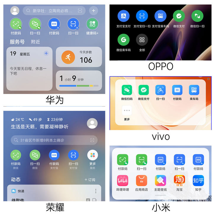 5款机型的快捷功能区都是分行排列着快捷功能图标,vivo和小米给功能区域添加了透明白底,减少背景对图标影响。