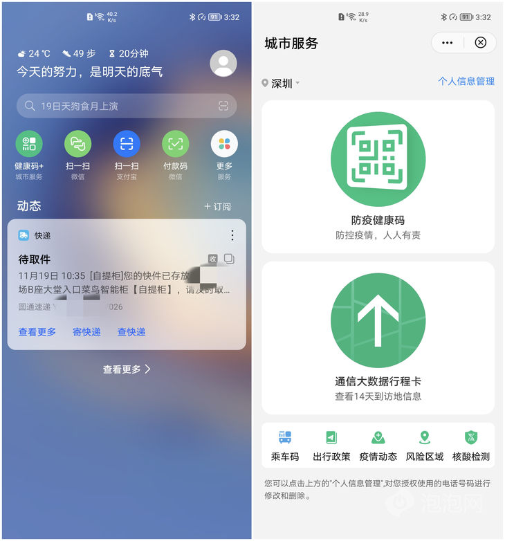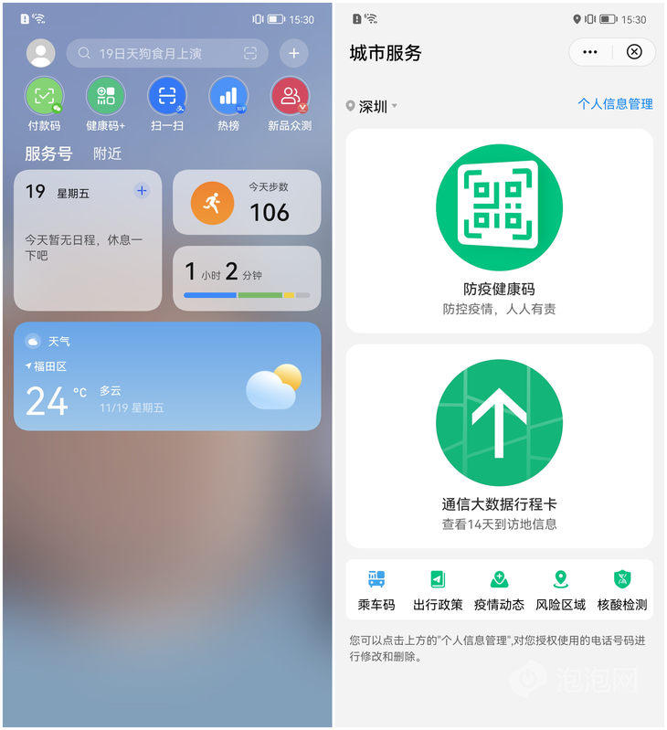 华为和荣耀提供了健康码+功能,把健康码和行程卡整合在一个页面,可分别跳转到支付宝健康码、行程卡页面,服务页面下方还提供出行政策查询、风险区域等疫情相关功能,相当于把用户常用的疫情相关功能集成在一起,更加方便一些。这两者也单独提供了支付宝健康码的快捷功能。