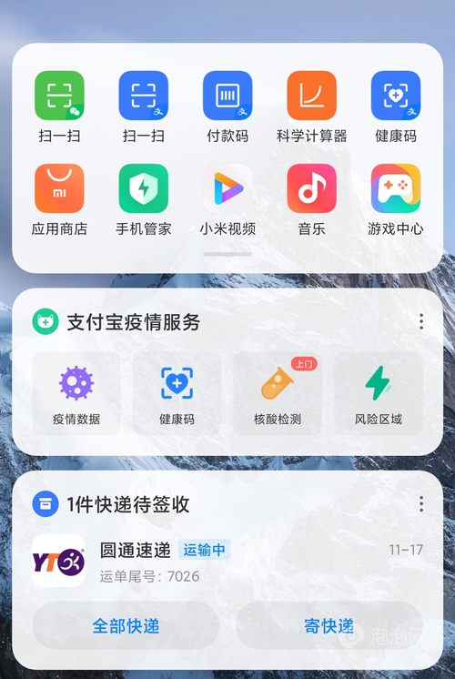小米也有疫情服务功能卡片,集成了支付宝的疫情服务,卡片上提供了疫情数据、健康码、核酸检测以及风险区域四大模块,用户点击会跳转到支付宝对应功能区域,卡片上无法直接获取到疫情相关信息。