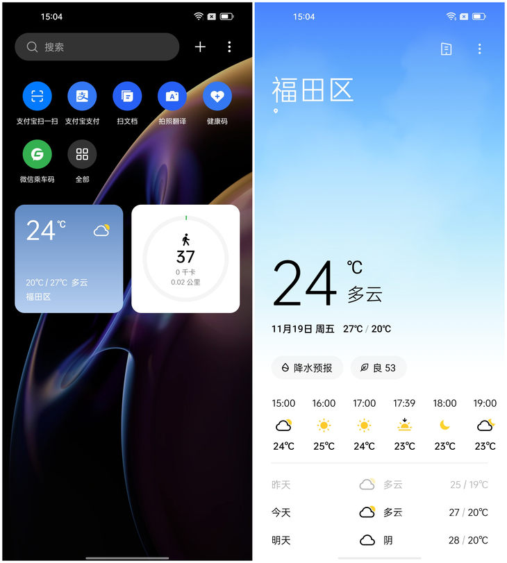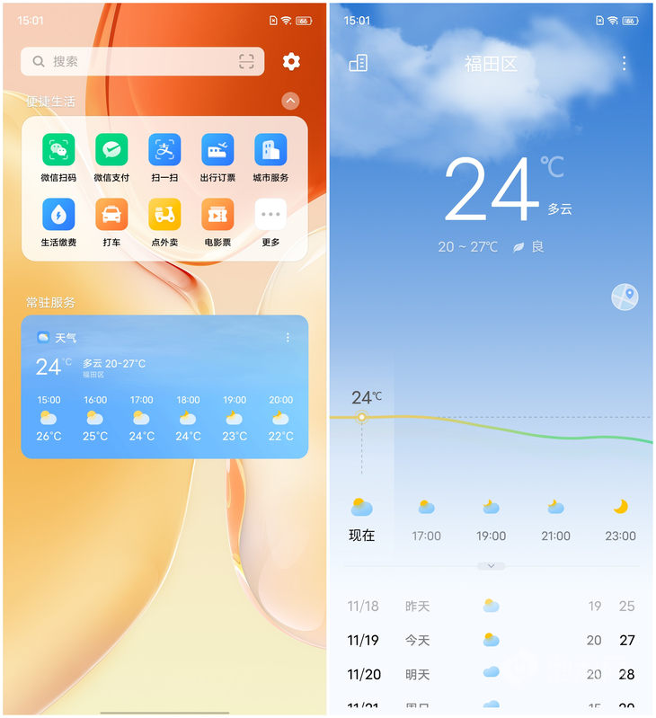 OPPO的天气卡片会显示当前温度、当天最高最低温以及当前天气预报的区域,点击可跳转天气页面,获取更详细的天气信息。