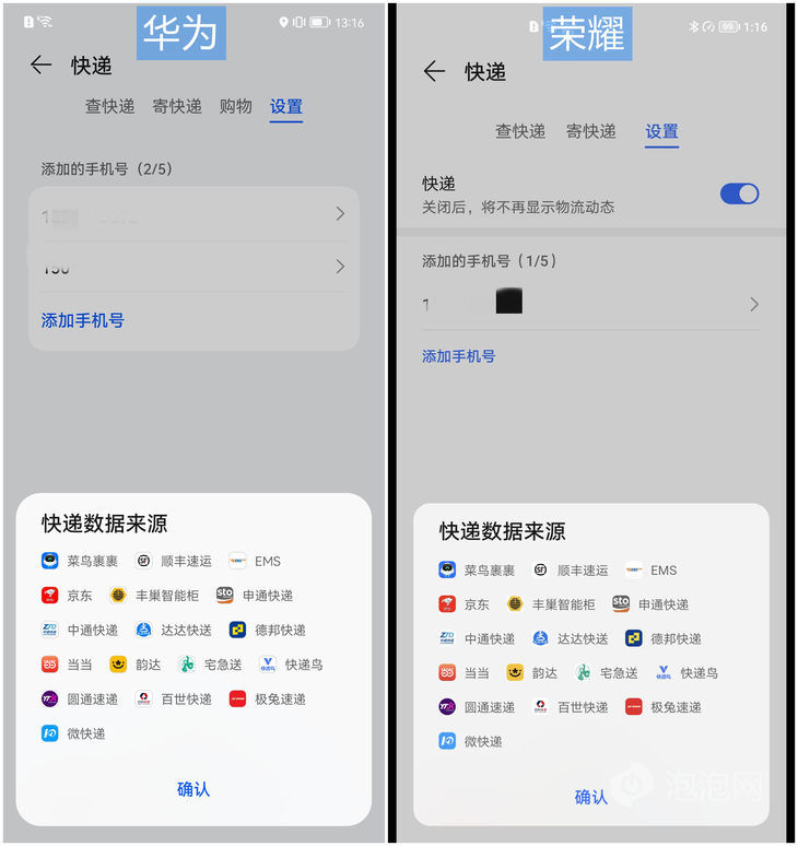 华为和荣耀的快递数据来源包括菜鸟裹裹、顺丰速运、京东等17家公司,轻松覆盖到主流的快递物流,属于比较全面的,实际体验中物流信息更新比较及时。