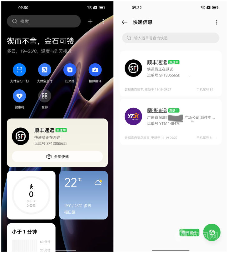 OPPO负一屏的快递卡片只显示一个快递信息,能够显示快递公司、运单号、运输状态以及部分物流信息,点进全部快递可查看多个快递物流信息。官方没有公布具体的快递数据来源,实际体验中,顺丰速运、韵达、圆通等快递都有物流信息提醒。不过有时候卡片提示会有所延迟,比如顺丰快递点进页面看已经是签收状态,卡片仍旧显示派送中。