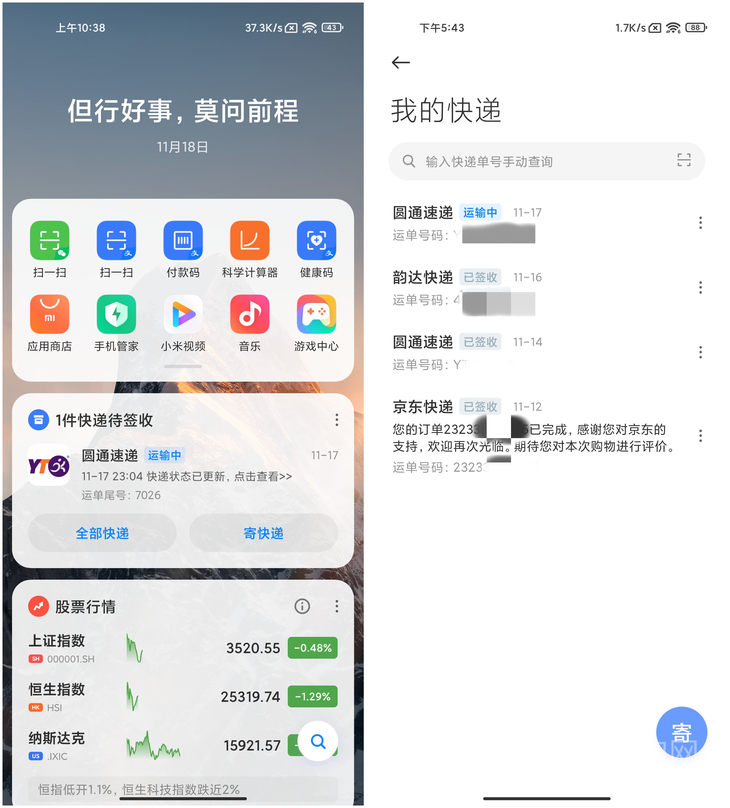 小米的快递卡片只显示单个快递状态,包括快递公司、运输状态、运单尾号,点击全部快递才能查看多个快递状态。