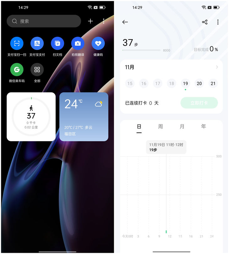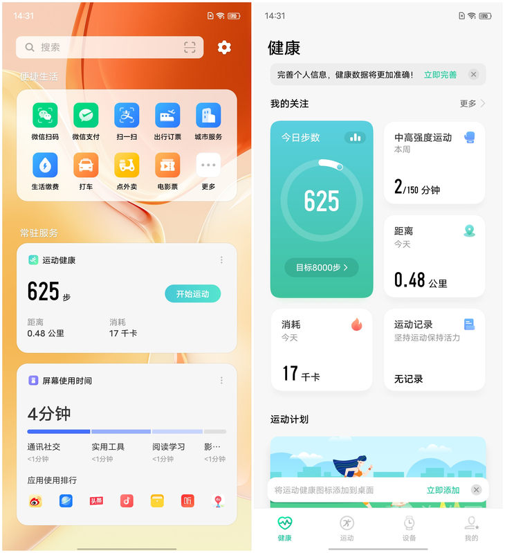 OPPO也有运动计步、应用使用时间卡片,在展示方式上更加生动形象。运动计步卡片除了会显示步数、热量、距离信息,还会通过圆环的方式提示距离目标步数还有多少,点击可查看详细信息。
