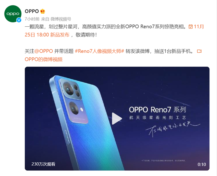 11月22日,OPPO官微公布了一段Reno7系列的预热短片,并且宣布新机将会在11月25日18:00正式发布。