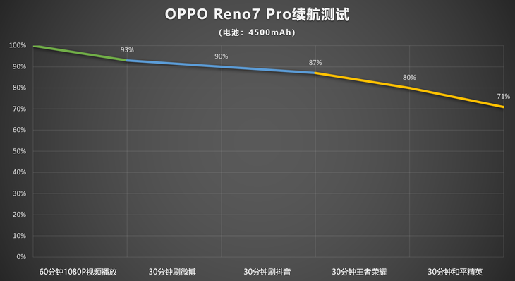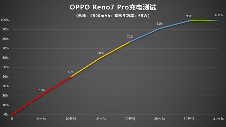 OPPO Reno7 Pro配备了4500mAh大电池,支持65W超级闪充,实际表现看下面实测数据。