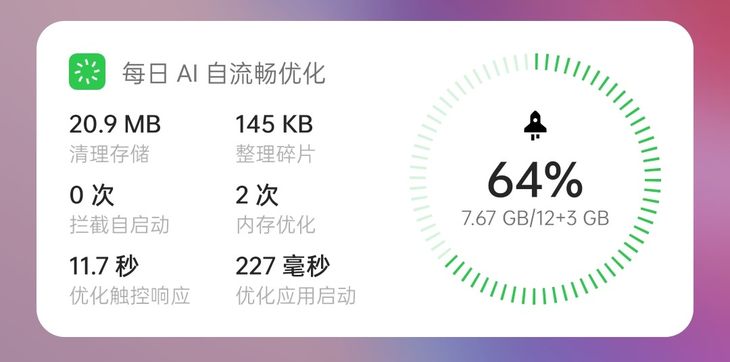 OPPO Reno7 Pro所搭载的ColorOS 12系统具有36 个月流畅双引擎加持,其中AI自流畅引擎2.0根据不同用户用机习惯,把应用进行优先级排序,先清理最不关心的后台进程,将资源按需分配,时刻保证系统流畅度。系统还通过了泰尔36个月抗老化测评,长时间使用也能保证系统流畅度。在负一屏的卡片上,用户可以看到每日AI自流畅优化效果。ColorOS 12系统搭载量子动画引擎 3.0,优化300+动画细节,让系统动画更加自然顺畅。
