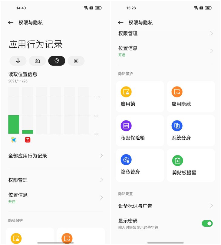 在用户隐私安全部分,ColorOS 12系统的保护功能覆盖多方面。分享照片时,可以选择抹除位置信息、拍摄参数,避免了暴露隐私的风险。当第三方应用调用摄像头、位置等权限时,系统会在状态栏提醒,用户也能够查看当前调用对应权限的APP,方便用户实时了解。系统还会以数据表格的形式展示权限记录,便于用户及时发现权限滥用行为。