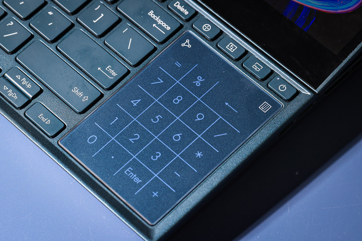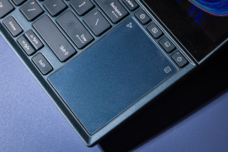 开机键位于触控板的前方。同时开机键的左侧还有三枚特定功能按键,从左到右依次为电脑运行模式切换按键、双屏窗口上下挪移按键、ScreenPad Plus触控副屏开/关按键。