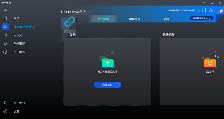 利用Link to MyASUS,这款笔记本能够实现与手机的无线互联,跨屏协同操作,市面上大多主流的智能手机均可以使用。在电脑上可以显示手机的界面,通过电脑屏幕来控制手机,比如我们可以在电脑上拨打手机电话,也可以访问手机内的微信、图片等信息,甚至可以将手机内的文件直接拖动到电脑里,传输速度比蓝牙更快。