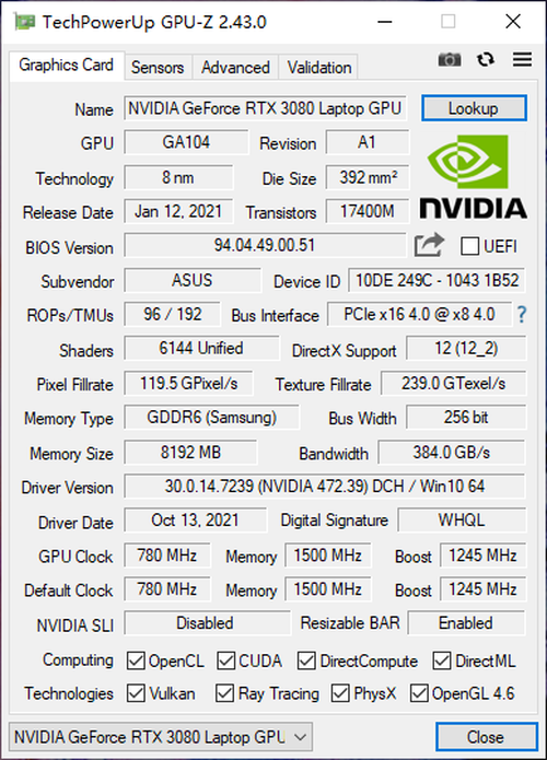接下来再来重点瞧瞧显卡。华硕灵耀X双屏Pro搭配了目前笔记本平台上面的旗舰显卡——RTX3080笔记本电脑GPU,其基于GA104显示核心打造,拥有6144组CUDA核心、96组光栅单元以及192组纹理单元,搭配有256bit位宽、8GB容量的GDDR6显存。