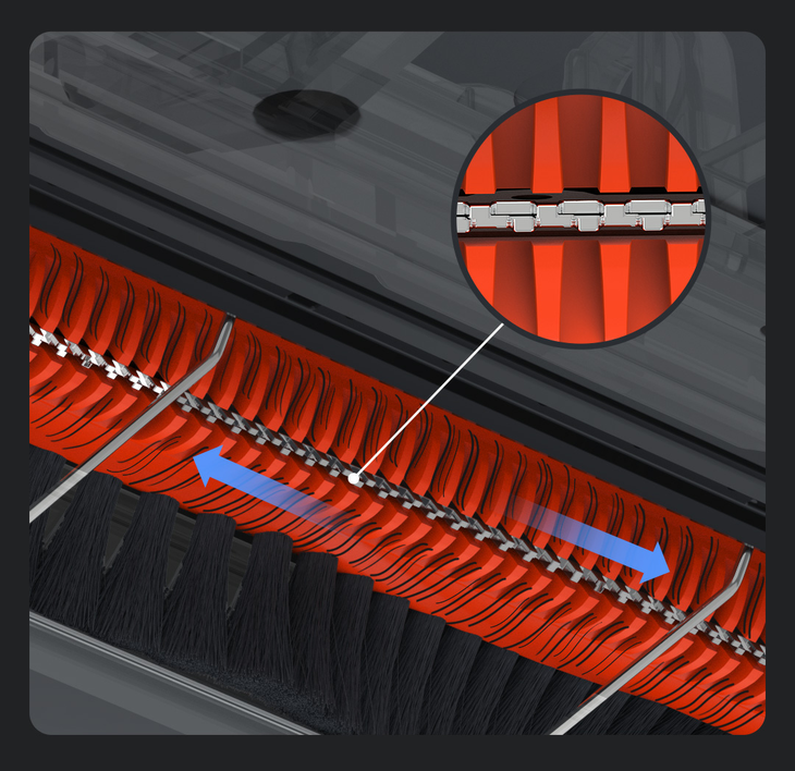 为了达到更好的防缠绕效果,主机内还加入了滚刷梳齿,可以理顺附着在滚刷上的毛发,让毛发在滚刷上缠紧,以便于钝齿刀片迅速切断。先理顺,后缠紧,再切断,三部高效解决毛发缠绕问题。