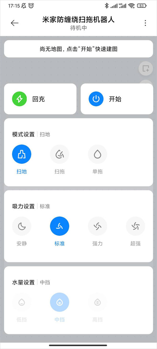 米家App——米家防缠绕扫地机器人系统里的主界面,设计有回冲、开始、模式设置、吸力设置、水量设置等主要功能。