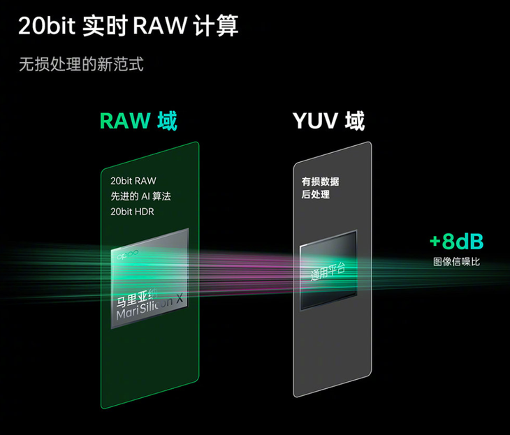 OPPO马里亚纳 X芯片可实现20bit实时RAW计算,相比传统计算影像有害后处理方式,能带来8dB信噪比的提升,为整个影像链路输出高质量的图像数据,影像基础画质、预览成像、三方APP画质都能得到提升。